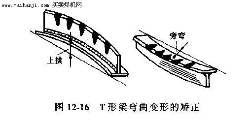 矯正T形梁的彎曲變形,應在凸的部位用三角形加熱。三角形的底邊取板厚的2倍,三角形頂點在中心線上或稍超過中心線,如圖12-16所示。加熱火焰用中性焰,加熱溫度800℃。加熱移動速度很慢,約為每秒4-1Omm。